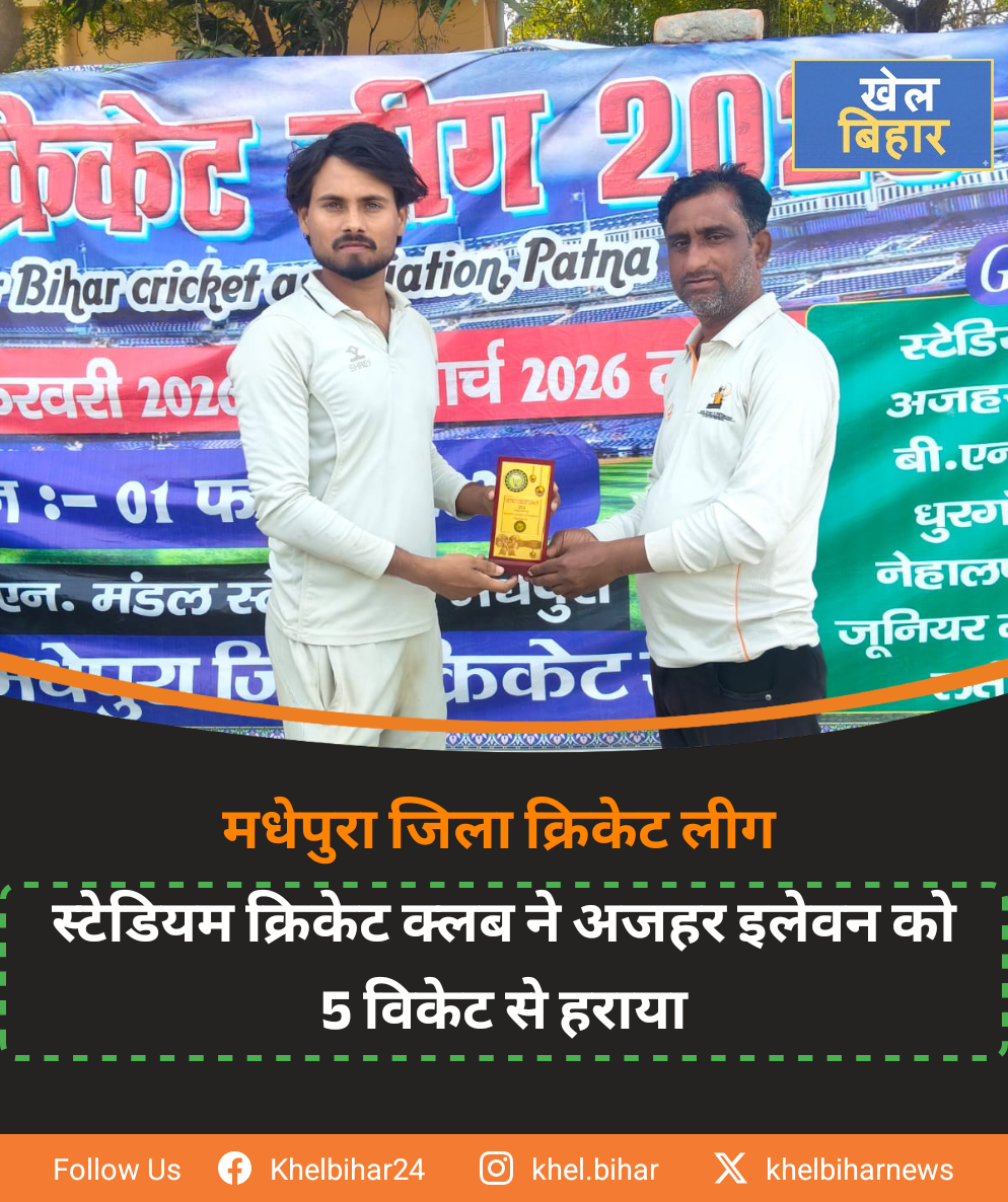 मधेपुरा जिला क्रिकेट लीग में स्टेडियम क्रिकेट क्लब ने अजहर इलेवन को 5 विकेट से हराया।