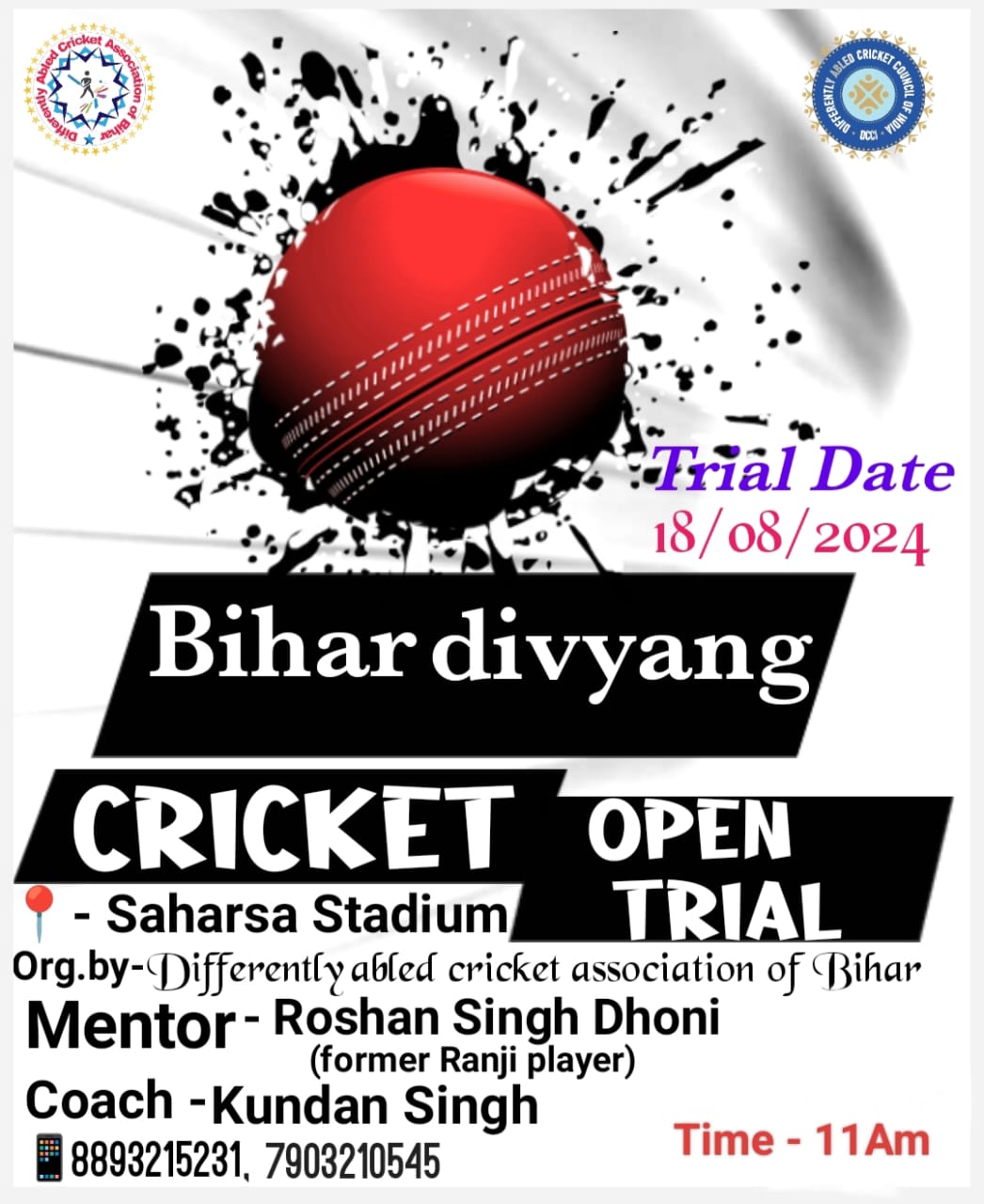 नेशनल डिसएबिलिटी क्रिकेट टूर्नामेंट के क्वालिफायर मैच के लिए डीसीएबी द्वारा ओपन ट्रायल 18 अगस्त को सहरसा में