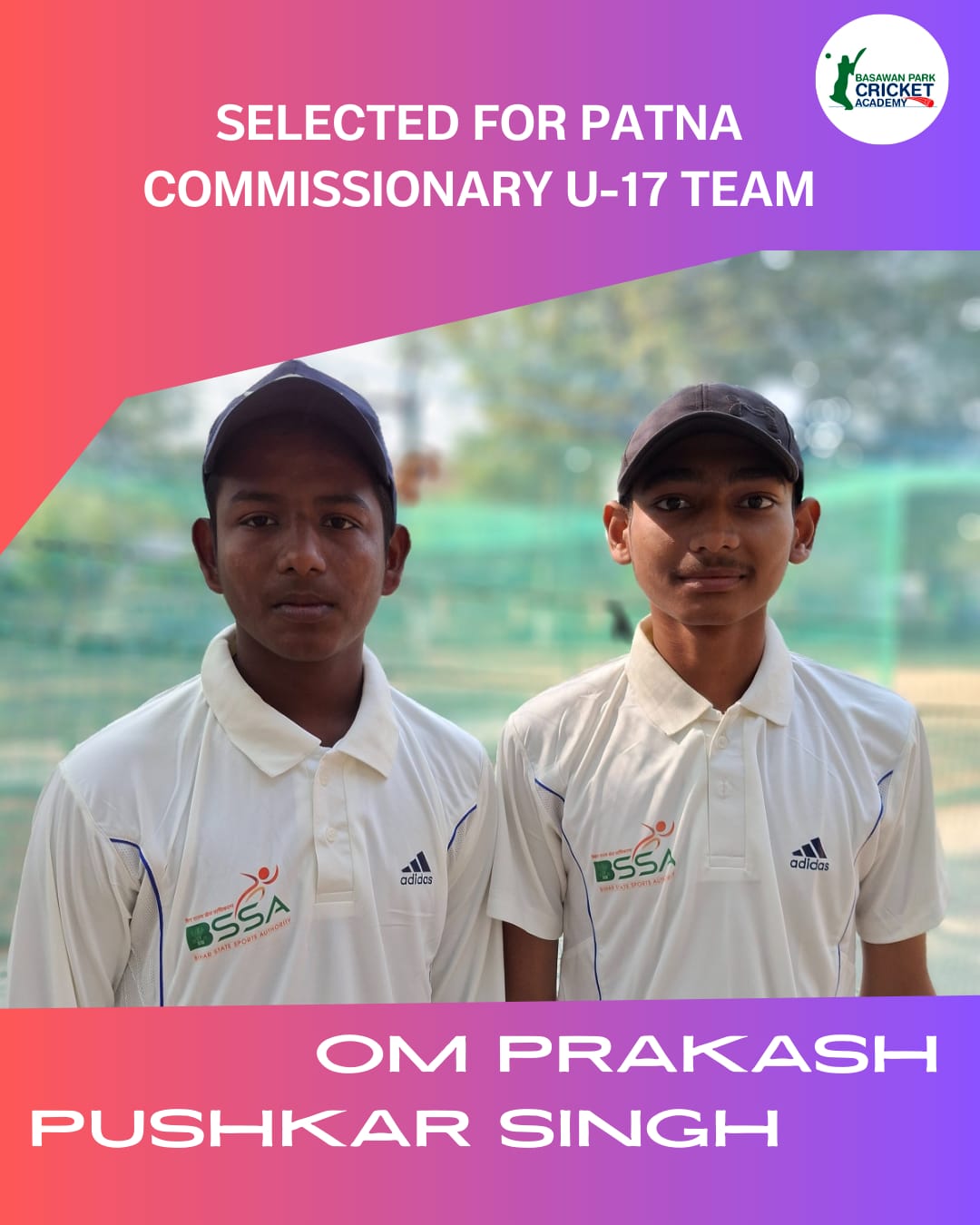बसावन पार्क क्रिकेट अकैडमी के दो खिलाड़ी ओम प्रकाश और पुष्कर सिंह का चयन अंडर -17 टीम मे