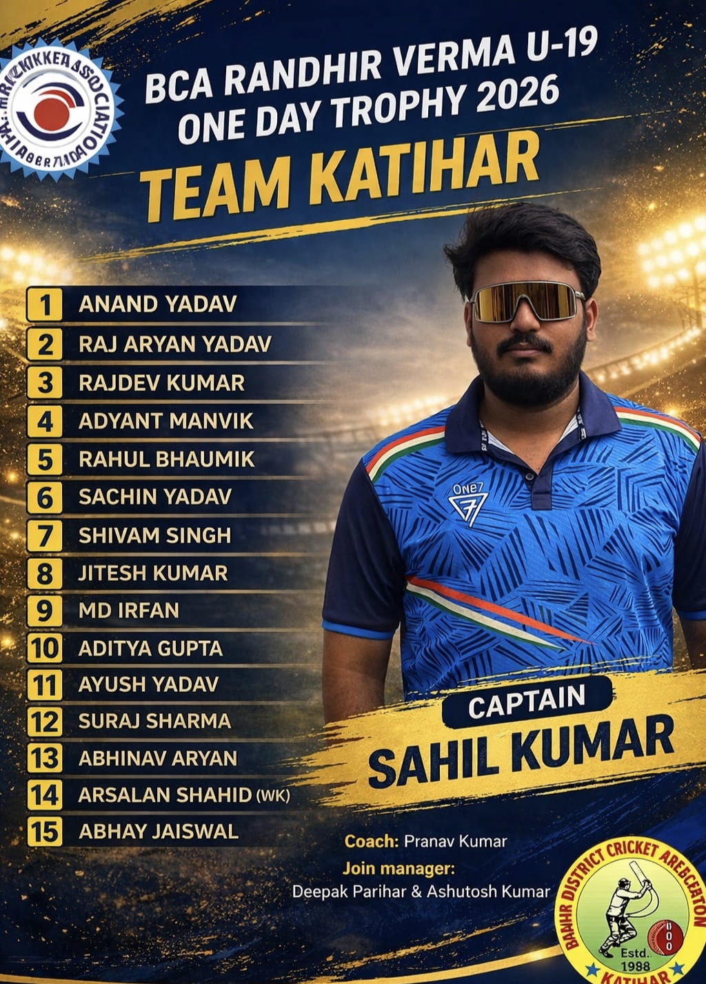 साहिल कुमार की कप्तानी में कटिहार अंडर-19 टीम घोषित, देखें टीम लिस्ट
