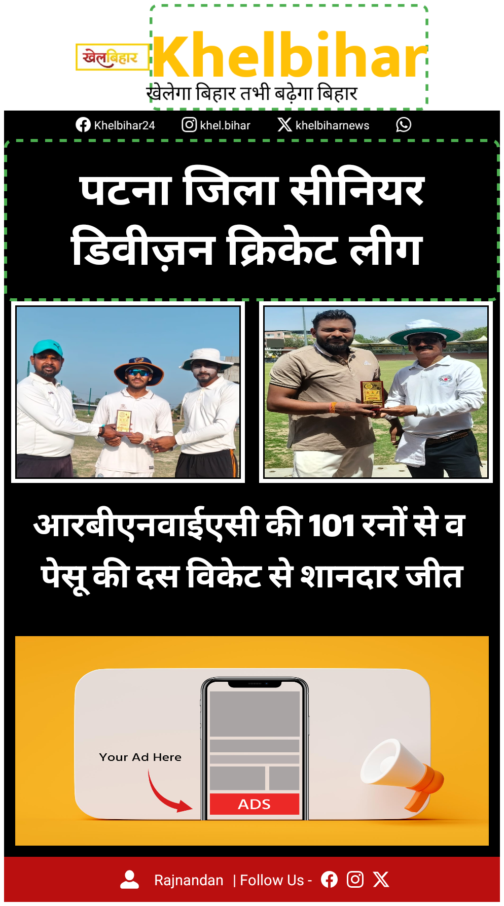 पटना जिला सीनियर डिवीजन क्रिकेट लीग:आरबीएनवाईएसी की 101 रनों से व पेसू की दस विकेट जीत
