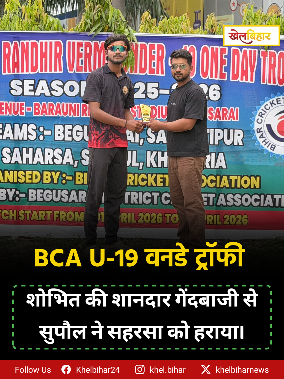 रणधीर वर्मा U-19 वनडे ट्रॉफी: शोभित की शानदार गेंदबाजी से सुपौल ने सहरसा को हराया।