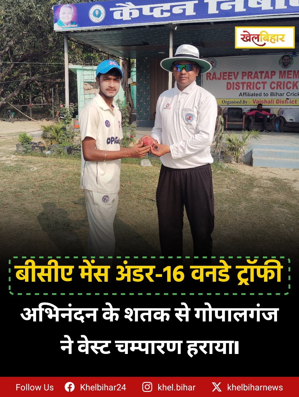 श्यामल सिन्हा U-16 वनडे ट्रॉफी: अभिनंदन के शतक से गोपालगंज ने वेस्ट चम्पारण हराया।