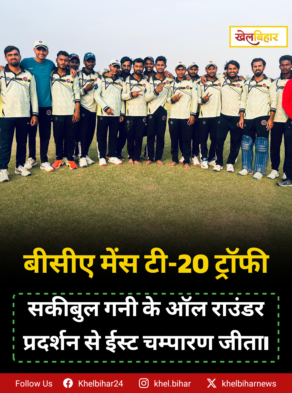 बीसीए मेंस टी-20 ट्रॉफी : सकीबुल गनी के ऑल राउंडर प्रदर्शन से ईस्ट चम्पारण जीता।