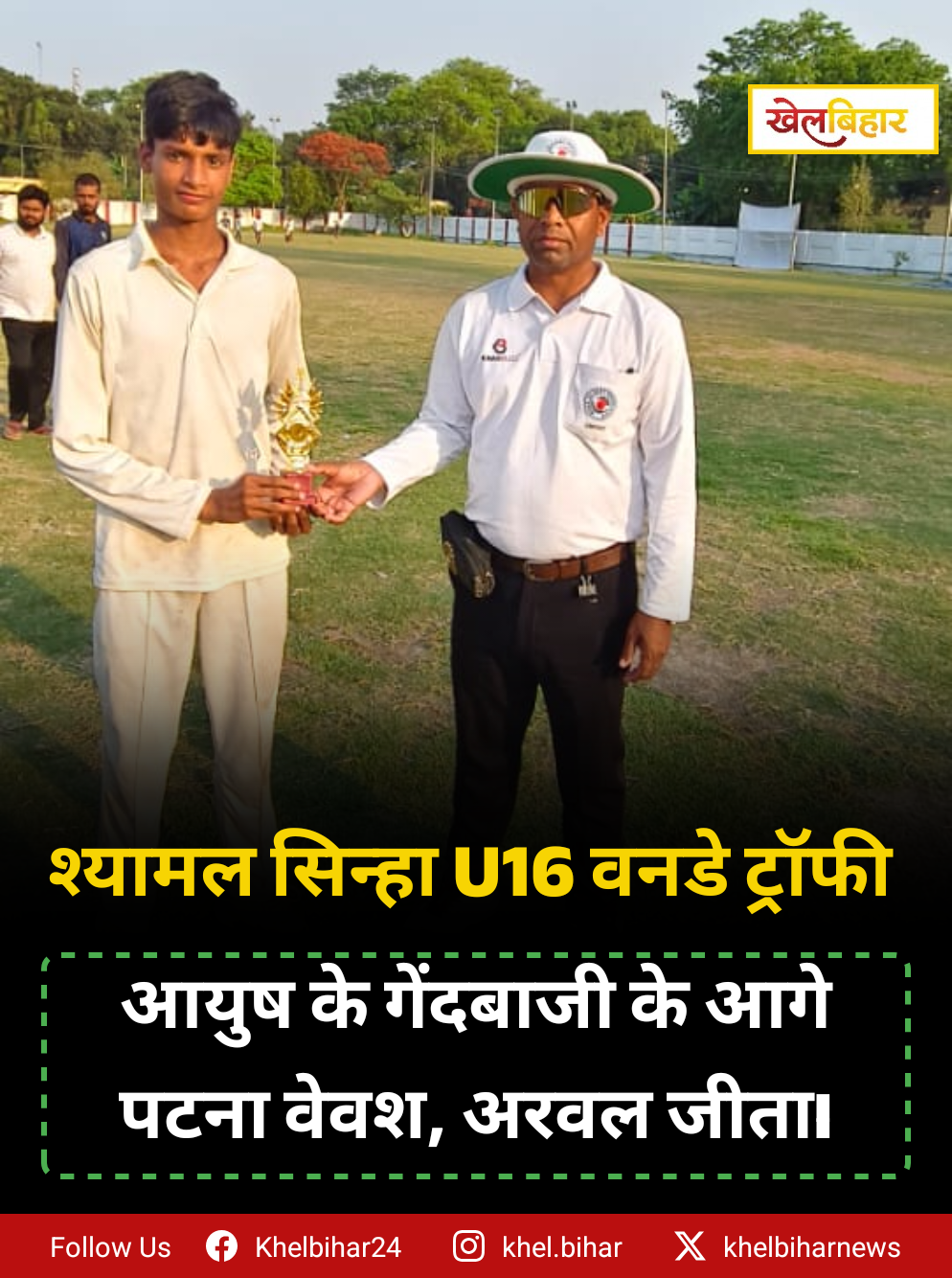 मैन ऑफ द मैच का पुरस्कार बीसीए पैनल के अंपायर सचिन कुमार ने दिया।इस अवसर पर बीसीए पैनल के अंपायर सचिन कुमार और अमित रंजन थे। वहीं स्कोरर के रूप में रामकुमार और विश्वजीत थे। मीडिया प्रभारी विवेक कुमार ने बताया 21 अप्रैल का मुकाबला बेगूसराय बनाम सहरसा के बीच सुबह 8 बजे से खेला जाएगा
