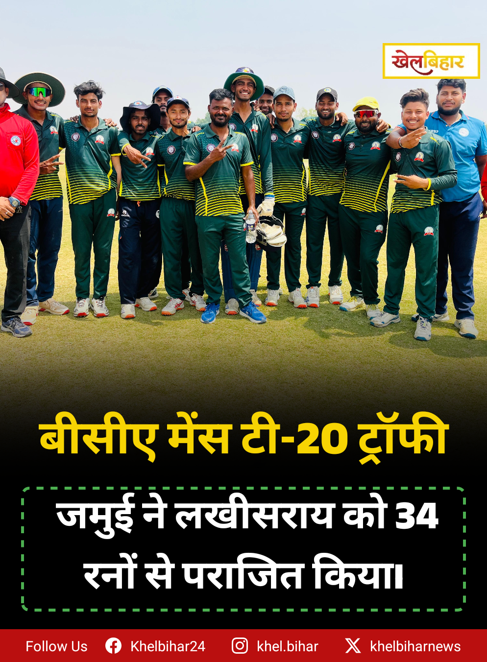 बीसीए मेंस टी-20 ट्रॉफी : जमुई ने लखीसराय को 34 रनों से पराजित किया।