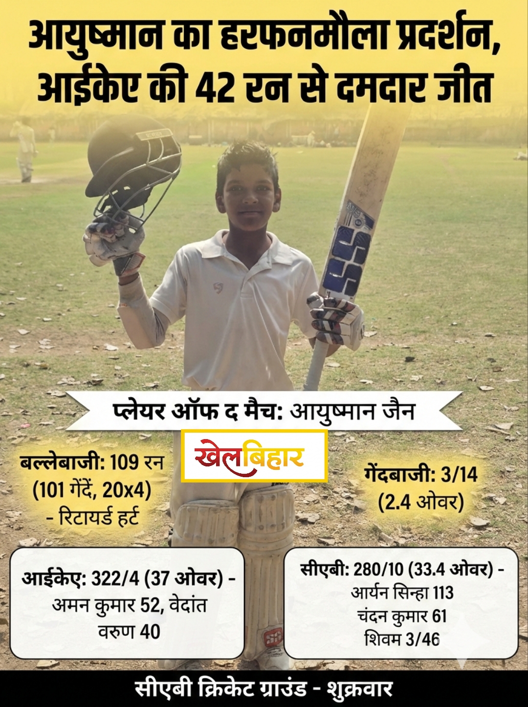 आयुष्मान का हरफनमौला प्रदर्शन,आईकेए की 42 रन से सीएबी को हराया