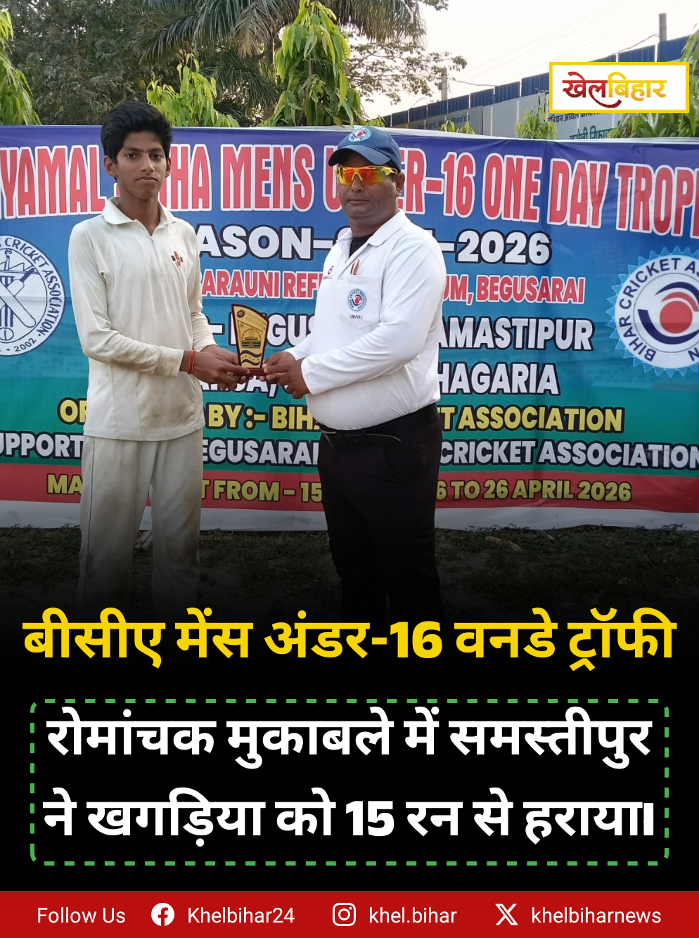 बीसीए मेंस श्यामल सिन्हा अंडर-16 टूर्नामेंट के रोमांचक मुकाबले में समस्तीपुर ने खगड़िया को 15 रन से हराया।
